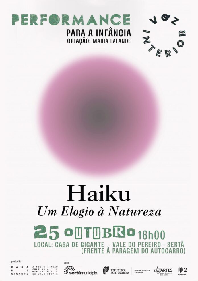 Com criação de Maria LaLande e haikus originais de Dinis Lapa, “Haiku – Um Elogio à Natureza” é interpretado por Ana Isabel Delgado e Catarina Marques Ramos. O espetáculo acontece na Casa de Gigante – Associação Cultural Mandriões no Vale Fértil e integra a programação “Voz Interior”. Conta com o apoio do Município da Sertã, República Portuguesa – Cultura / e da Direção-Geral das Artes.